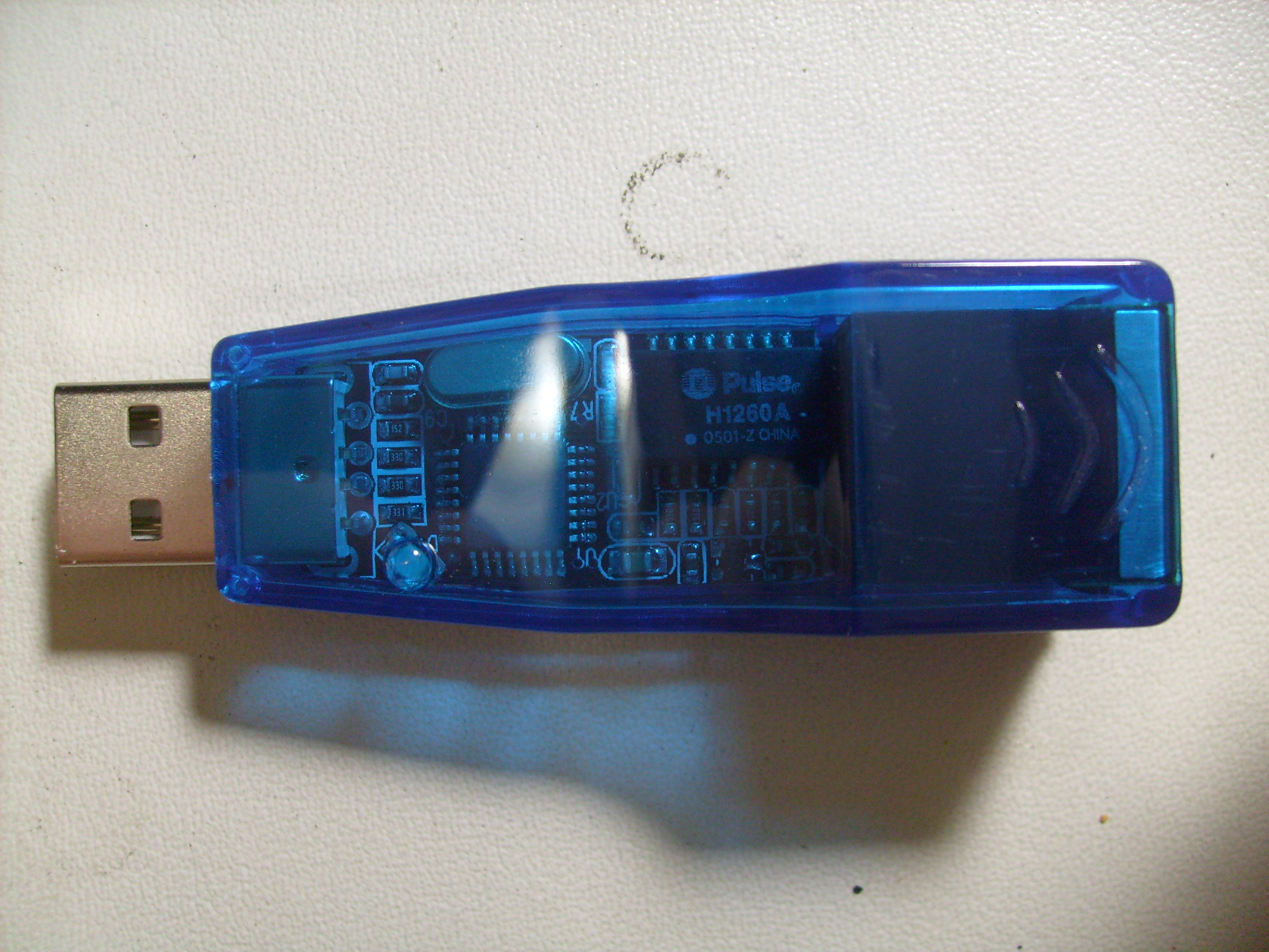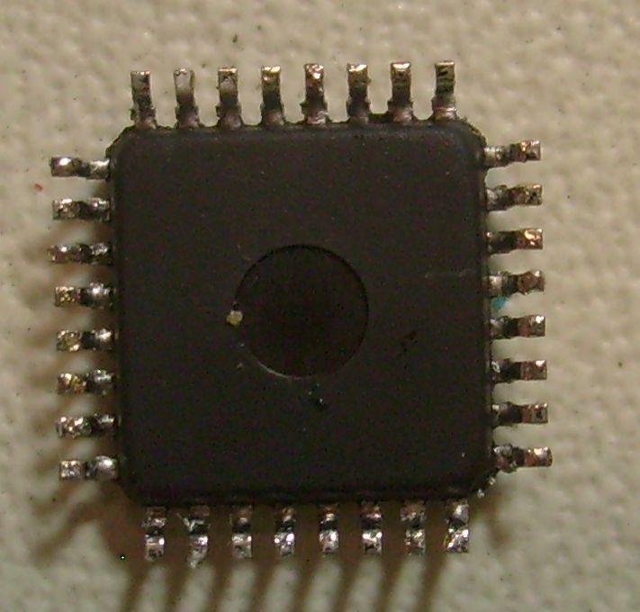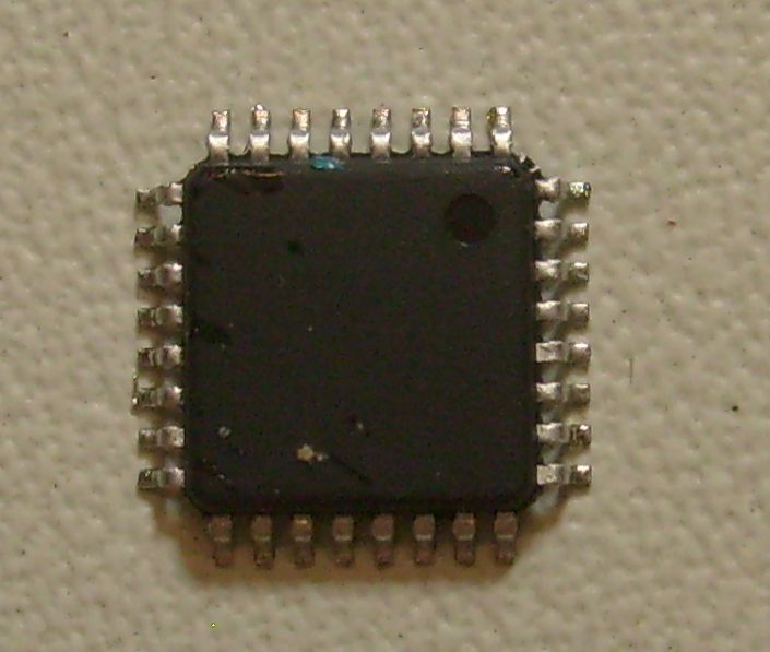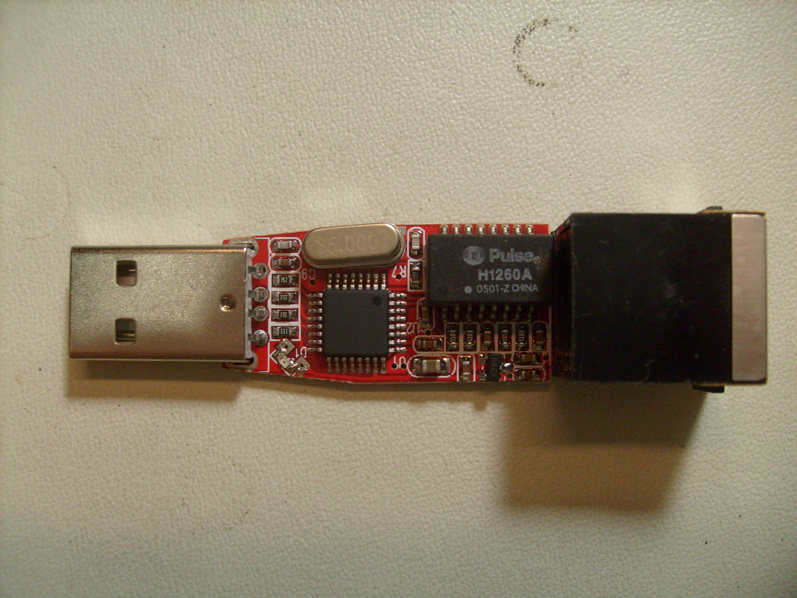 Packaged in a blank (un-engraved) 32-pin QFP package from a USB-to-Ethernet dongle.