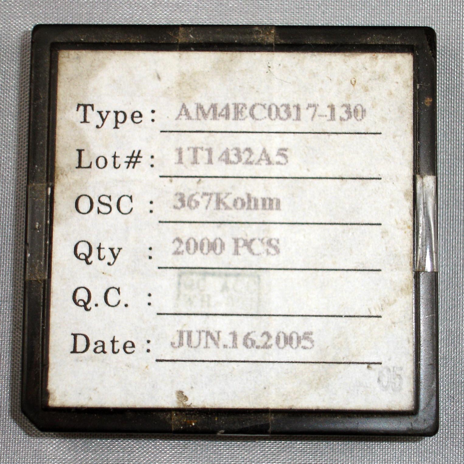 Type: AM4EC0317-130 Lot#: 1T1432A5 OSC: 367Kohm Qty: 2000PCS Q.C.: QC ACC ? Date: Jun.16.2005