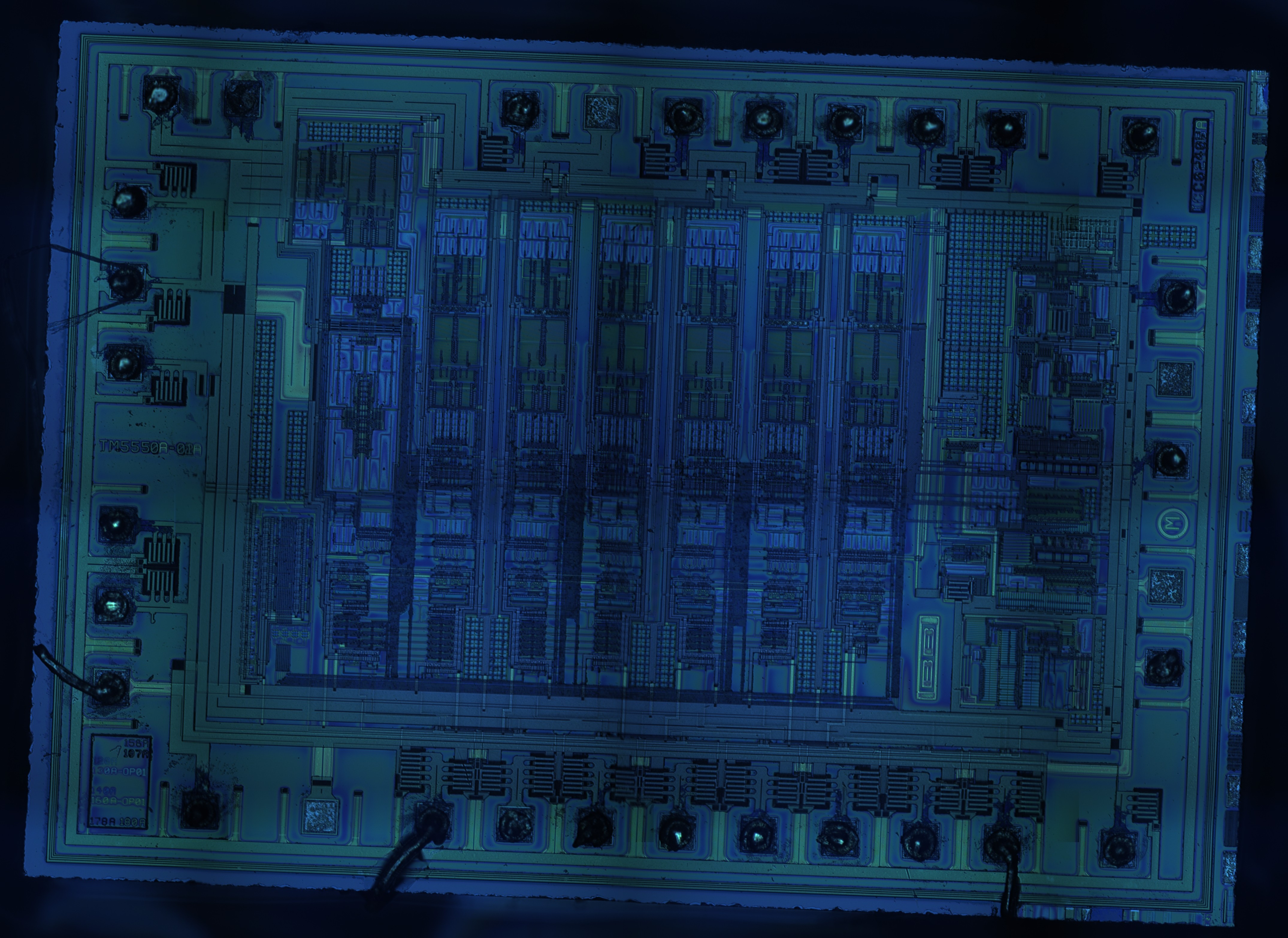 “Today we have the ADS830 (8bit, 80MSPS) analog to digital converter from Texas Instruments. This is a pipelined ADC so it is likely that each of the vertical sections in the center (there are six) probably contains a two-bit flash ADC, DAC and appropriate amplifiers for taking the difference and gain after each stage. It is likely that there is a single voltage reference location that supplies all of the comparators. Given that this is an 8bit ADC that incorporates some sort of digital error correction, and there are six 2bit stages, there may be some stage redundancy to allow for higher certainty of the lower bits.”